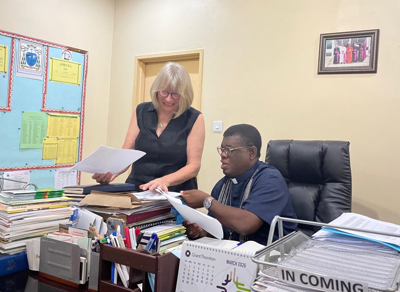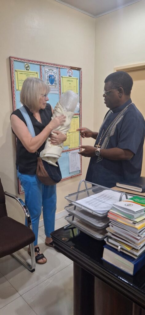 Unser zweiter Tag in Solwezi beginnt mit einem besonderen Termin: Wir besuchen Bischof Charles Kasonde. In einer offenen und herzlichen Atmosphäre sprechen wir über den aktuellen Stand der verschiedenen Projekte und tauschen uns über die nächsten Schritte aus. Ein besonderer Moment ist die Übergabe einer Madonna-Figur – „Mother Mary of Lourdes“. Sie wurde von Bernd Faßbender gestiftet und ist für die geplante Bernd-Faßbender-Kirche in Kalivingi bestimmt.