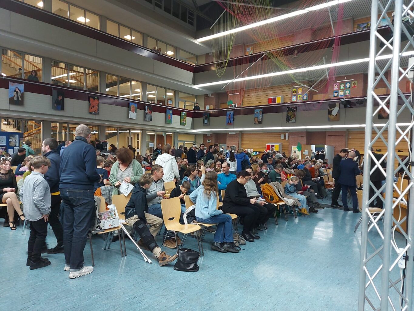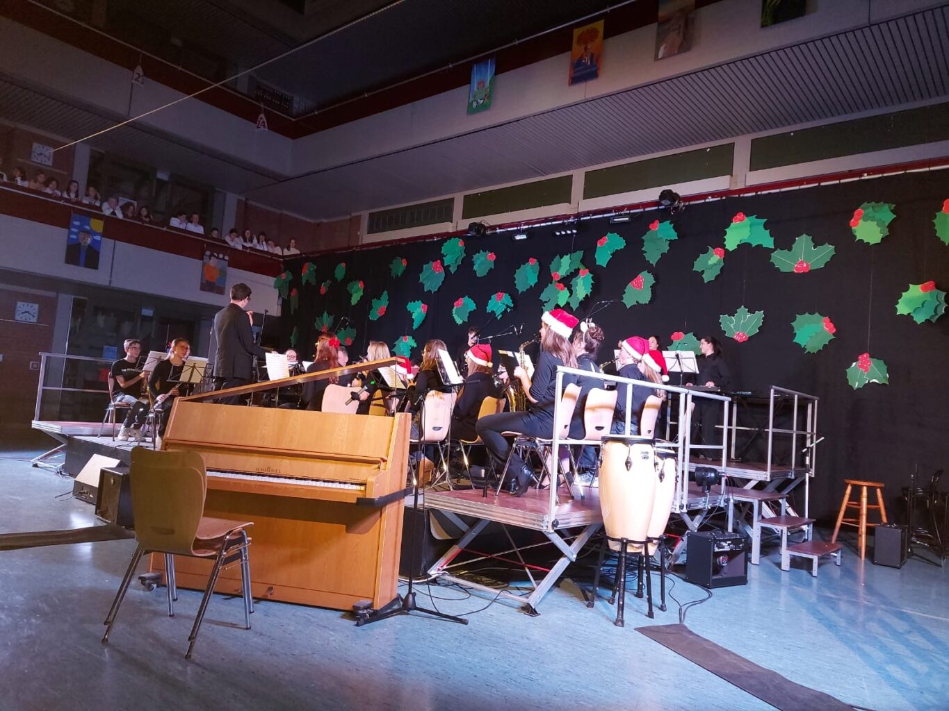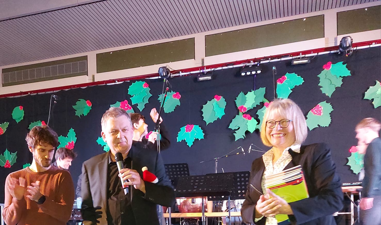 Ein besonderer Höhepunkt des Abends war das Konzert, das sowohl Schülerinnen und Schüler als auch die Lehrer gestalteten. Vor dem festlichen Bühnenbild trugen mehrere Ensembles des FKG ihre stimmungsvollen Lieder vor. Und die Schulbands zeigten ihr Können dem begeisterten Publikum, das sich mit Applaus und Standing Ovations bedankte. Ein rundum gelungener Abend!