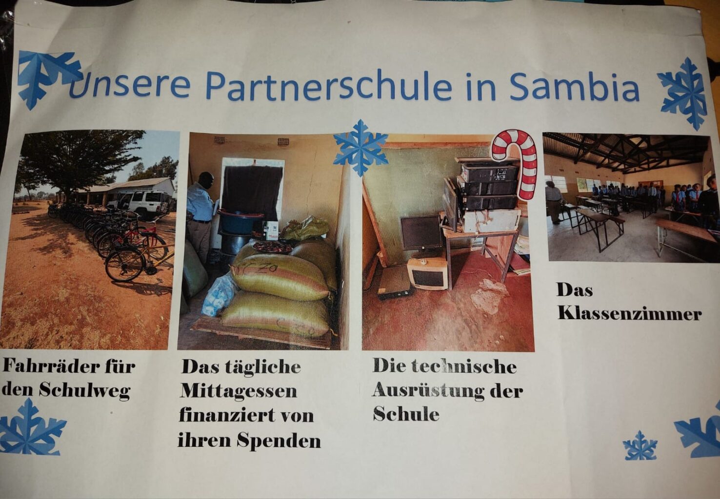 Vor wenigen Tagen fand die Weihnachtsfeier des FKG statt. In der Aula gab es eine Ausstellung zu unterschiedlichen Themen. Darunter auch ein Stand, an dem die Jugendlichen zu ihrer Patenschule in St Kalemba informierten. Dort konnte man auch Souvenirs aus Sambia und Bastelarbeiten von Mitgliedern des Sambia e. V. erwerben.