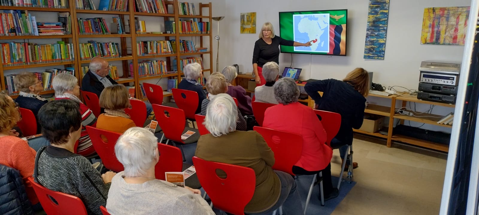 Nach einer gemütlichen Kaffeerunde mit selbstgebackenen Kuchen wurden bereits erste Gespräche geführt. Im Nebenraum – im „Kinosaal“ – hielt Anita Bartsch einen Vortrag über die Ziele und Projekte des Sambia-Vereins. Viele Fragen zu den Projekten wurden beantwortet. Vor allem war es ein Anliegen der Gäste zu wissen, wohin das Spendengeld gelangt und wie die Organisation des Sambia-Vereins finanziell aufgestellt ist.