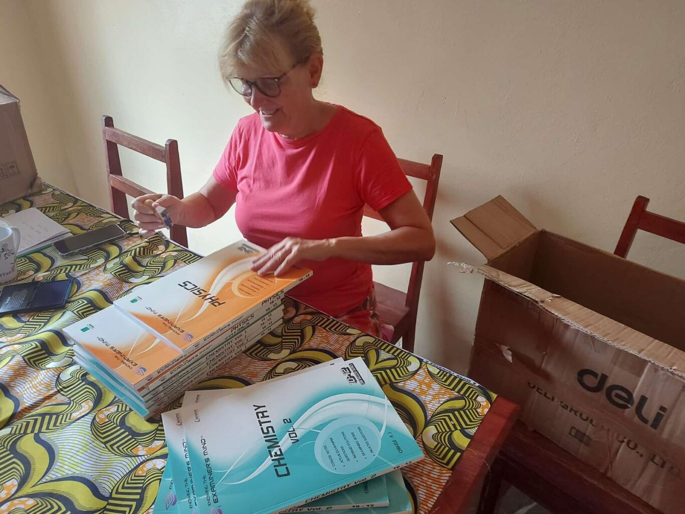 Anschließend haben wir die neuen Schulbücher für Kalivingi gestempelt.